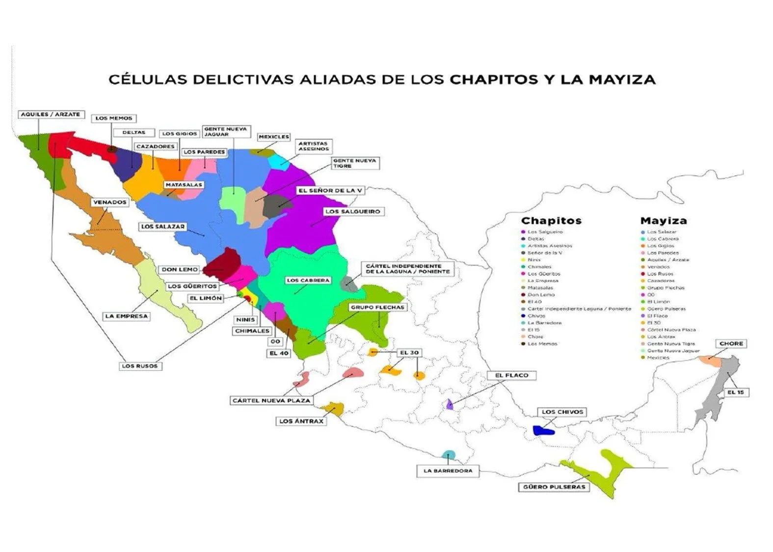 Each color represents a separate criminal cell such as Los Salgueiro, Los Cabrera, Los Rusos, Los Ninis, and Los Güeritos. Together they form a network of semi-autonomous regional groups that sustain one of the most powerful criminal syndicates in the Western Hemisphere.